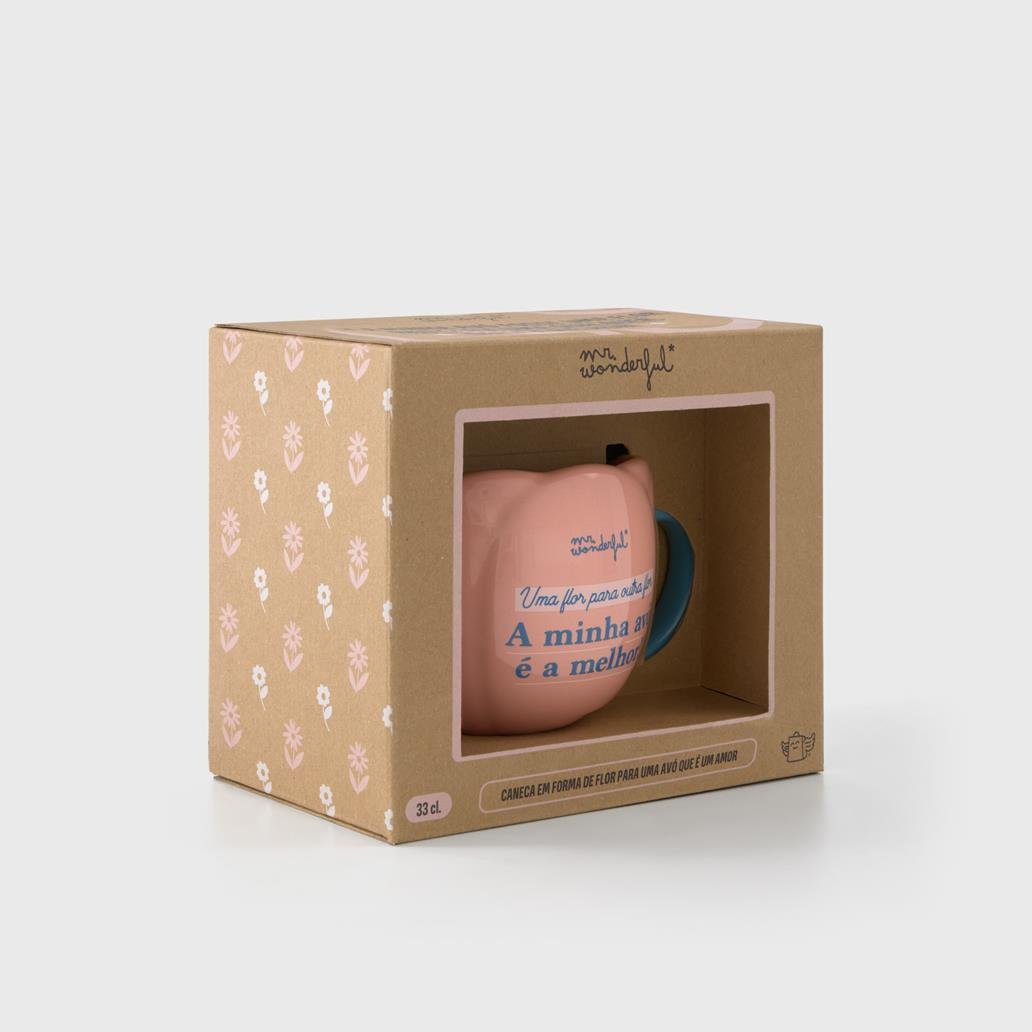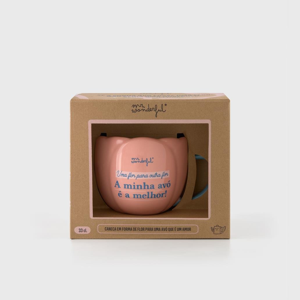 CANECA EM CERÂMICA EM FORMA DE ROSA, COM MENSAGEM PARA AVÓS, RELACIONADO COM O FORMATO DA CANECA.