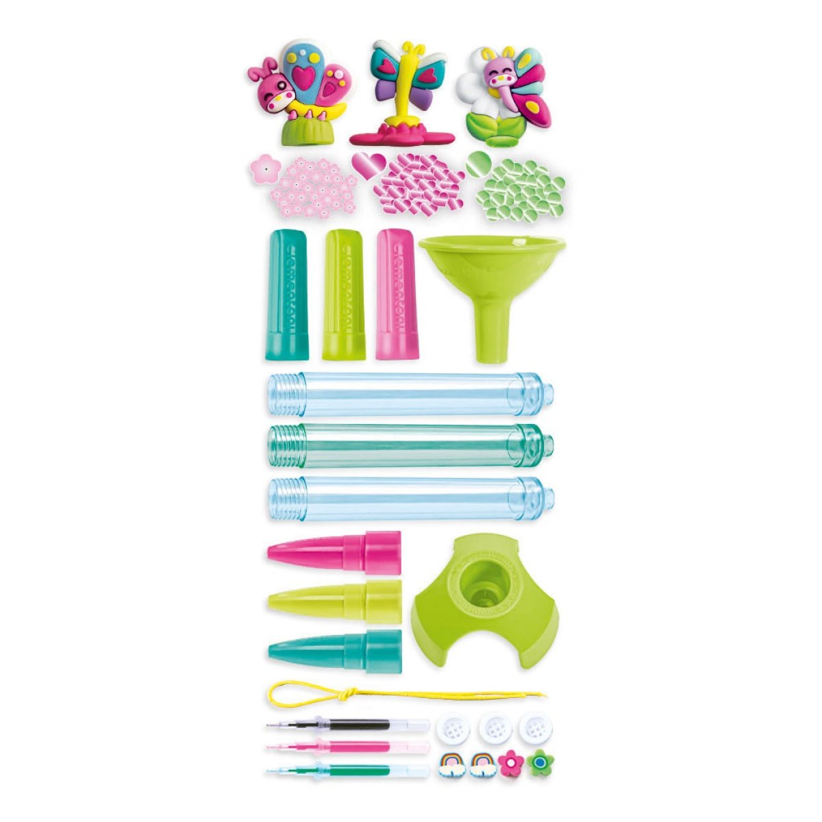 Um original kit criativo, que permite montar canetas e personalizá-las com diferentes decorações, escolhendo entre três temas diferentes.