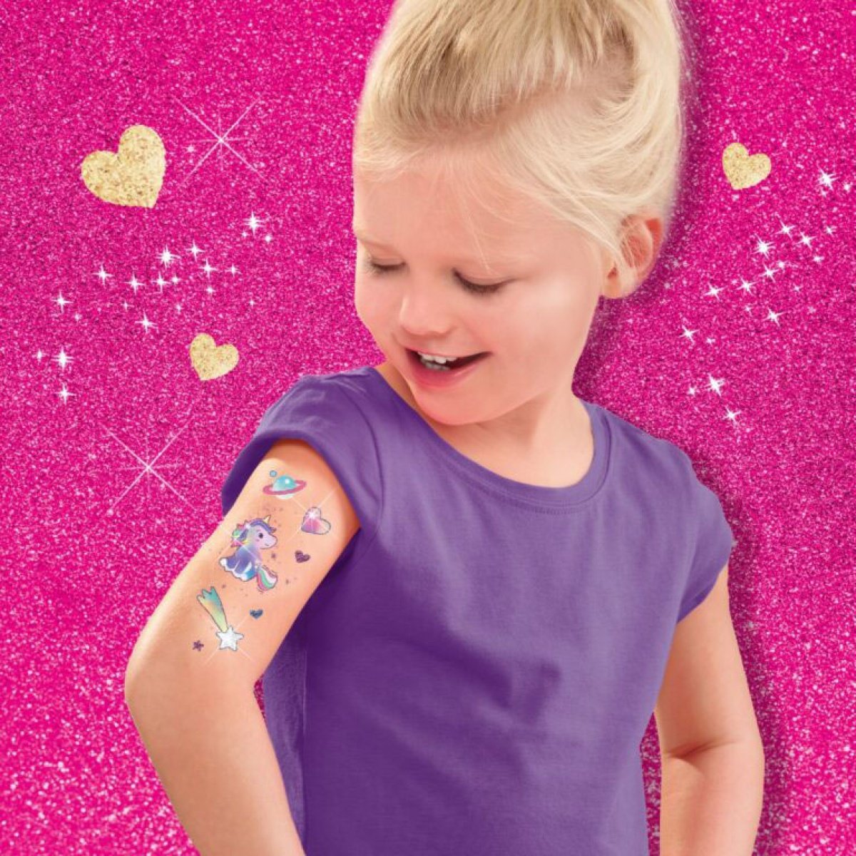 Além das tatuagens, o conjunto inclui duas cores de purpurinas cosméticas e cola para brilho, para ainda mais brilho e personalização.